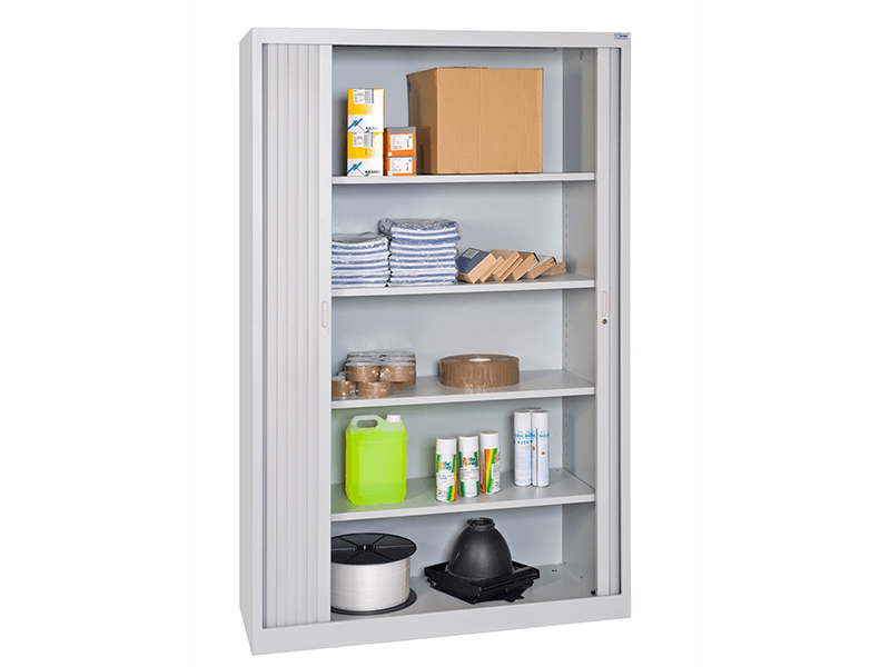 Les armoires portes rideaux sont proposées en 2 hauteurs : 1 000 mm (2 étagères) et 1 950 mm (4 étagères) et en largeur 1 200 mm. La largeur utile de l’armoire est de 1 045 mm